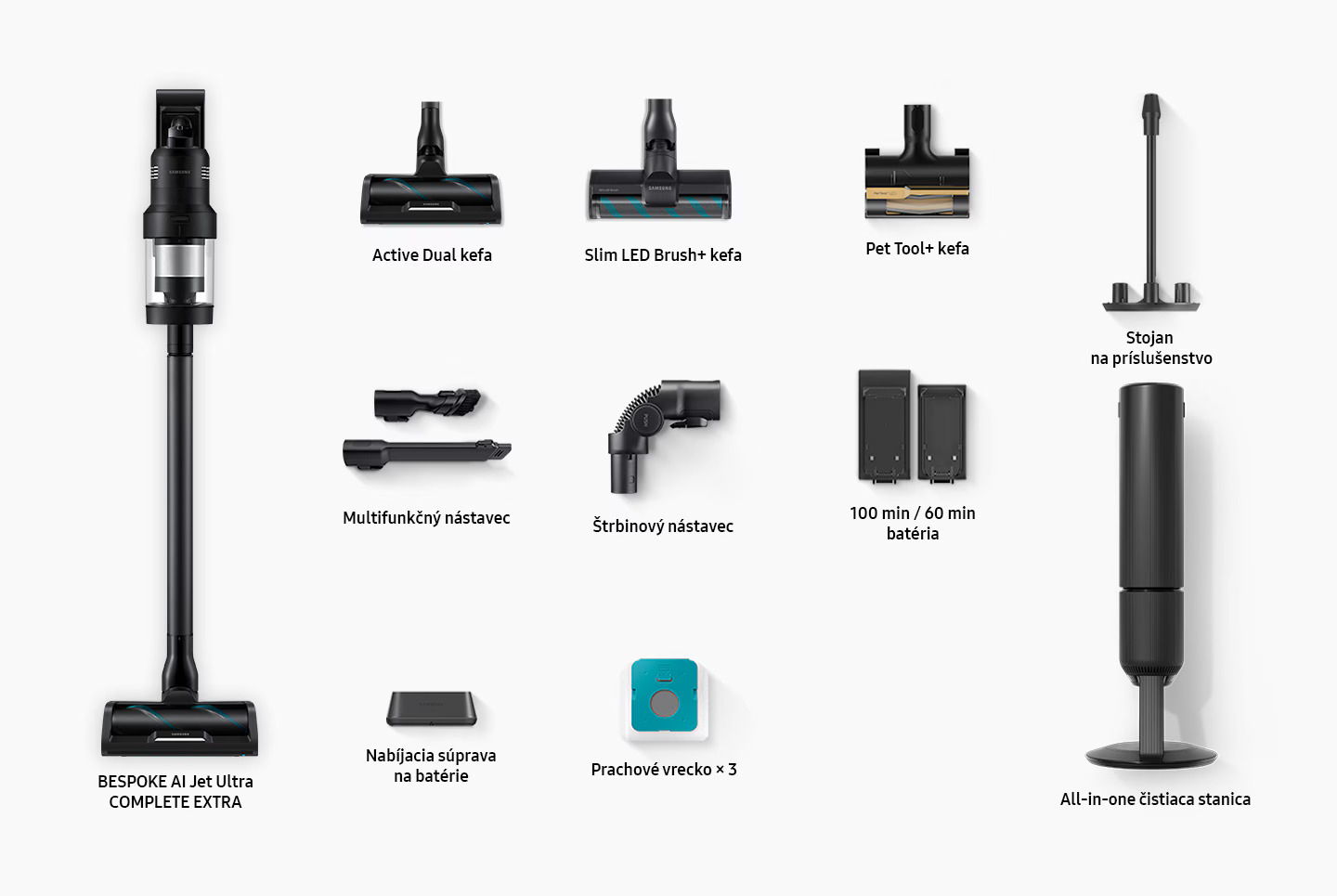 Pridajte nadstavec Active Dual Brush alebo Slim LED Brush+ a spoznajte výhody AI režimu. Špeciálne kefy dôkladne odstránia všetky nečistoty. Výkon sa dokonale prispôsobí typu povrchu. Užite si inteligentné vysávanie a perfektnú ovládateľnosť. Efektívne riešenie má nízku spotrebu energie. Režim AI Cleaning 2.0 dokáže vyhodnocovať rôzne typy podláh i rozlišovať odlišné druhy kobercov. Pracuje rovnako ako v režime Mid, v porovnaní s ním však znižuje spotrebu batérie o 14 % a zvyšuje flexibilitu pri ovládaní vysávača o 6 % na základe interných testov Samsung.
