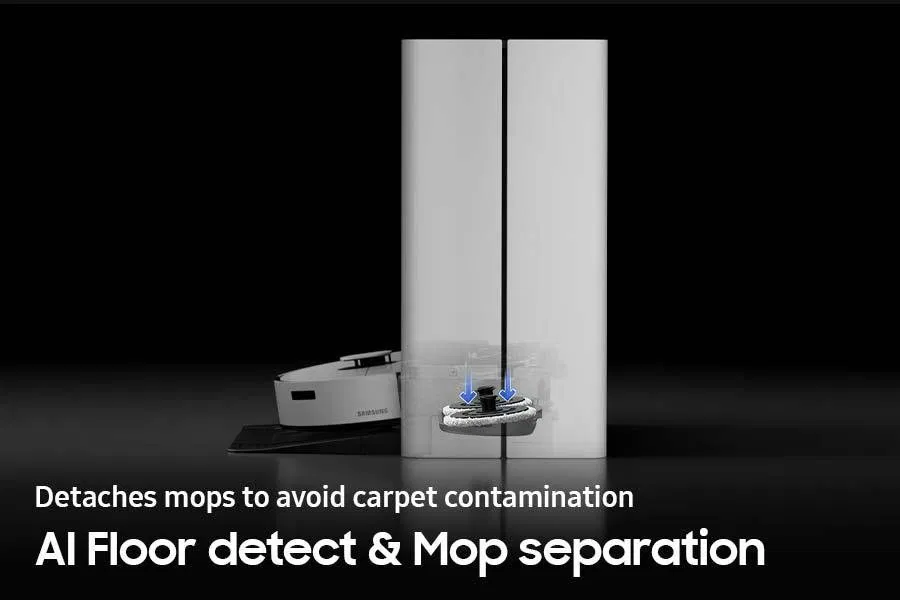 Ako sme už pri vysávačoch od spoločnosti Samsung zvyknutí, aj pri vysávači Samsung Bespoke Jet Bot Combo+ získate pokročilé možnosti upratovania: Napríklad funkcia AI Floor Detect dokáže rozpoznať rôzne typy podláh vďaka čomu vysávač eliminuje riziko namočenia kobercov. Keď smart robotický vysávač BESPOKE deteguje koberec, automaticky zdvihne vankúšiky alebo ich na základni odpojí, aby sa predišlo kontaminácii. Táto funkcia tiež zvyšuje sací výkon, zaistí rýchlejšie a efektívnejšie upratovanie.