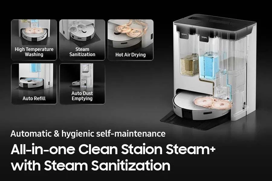 All-in-One čistiaca stanica Clean Station Steam+ s parnou dezinfekciou ponúka efektívne, hygienické a beznámahové čistenie. Táto stanica automaticky čistí textílie mopov pomocou pary a vody pri vysokej teplote, čo zaisťuje ich dezinfekciu a následné sušenie horúcim vzduchom s teplotou 55 °C. Navyše sa postará aj o vyprázdnenie prachovej nádoby.