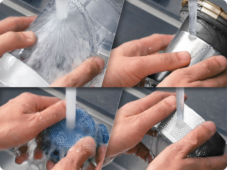 Celý 0,8 l prachový kôš, vrátane multicyklónového systému je kompletne umývateľný, takže ho môžete udržať v maximálnej hygienickej čistote. Nahromadený prach potom môžete ľahko vysypať, bez nutnej manipulácie so zariadením a odpojením hubice od tela.