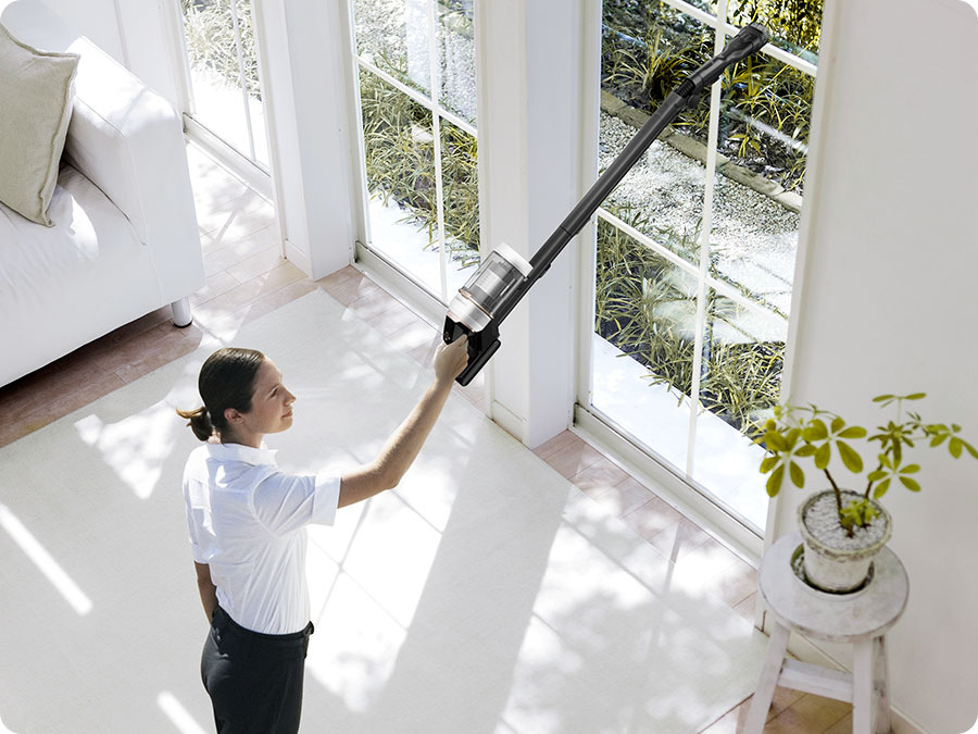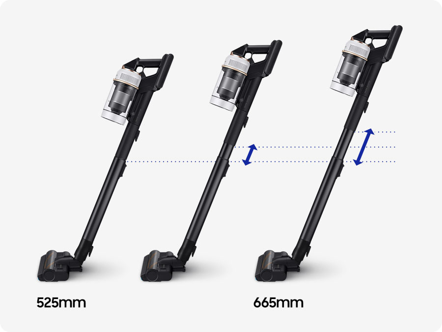 Telo vysávača BESPOKE Jet Plus Pet bolo ergonomicky navrhnuté a špeciálne odľahčené, takže sa s ním oveľa pohodlnejšie manipuluje a zároveň šetrí vaše zápästie. Ešte vyššiu úroveň komfortu poskytuje prispôsobiteľná teleskopická hubica, ponúkajúca až tri možné úrovne nastavenia.