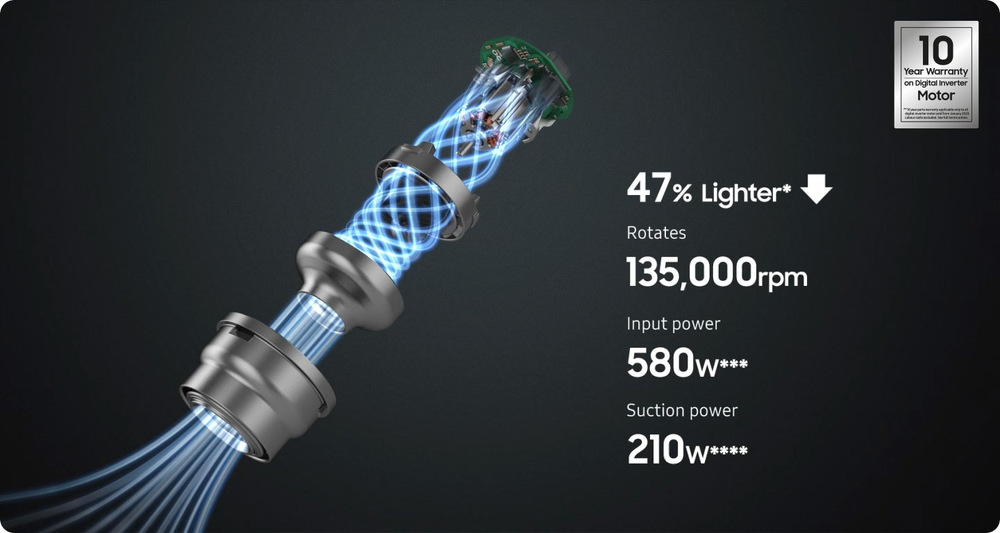 Zbavte sa neporiadku i starostí pomocou inovatívneho motora HexaJet. Ten prispôsobuje prúdenie vzduchu tak, aby vysávač ľahko prechádzal po koberci alebo podlahe a pritom účinne vysal všetky spadané nečistoty. Silný výkon 210 W, príkon 580 W a rýchlosť 135 000 ot./min. prináša energeticky úsporné riešenie na upratovanie celej domácnosti. Spoločnosť Samsung tiež navyše poskytuje až 10-ročnú záruku na diely.