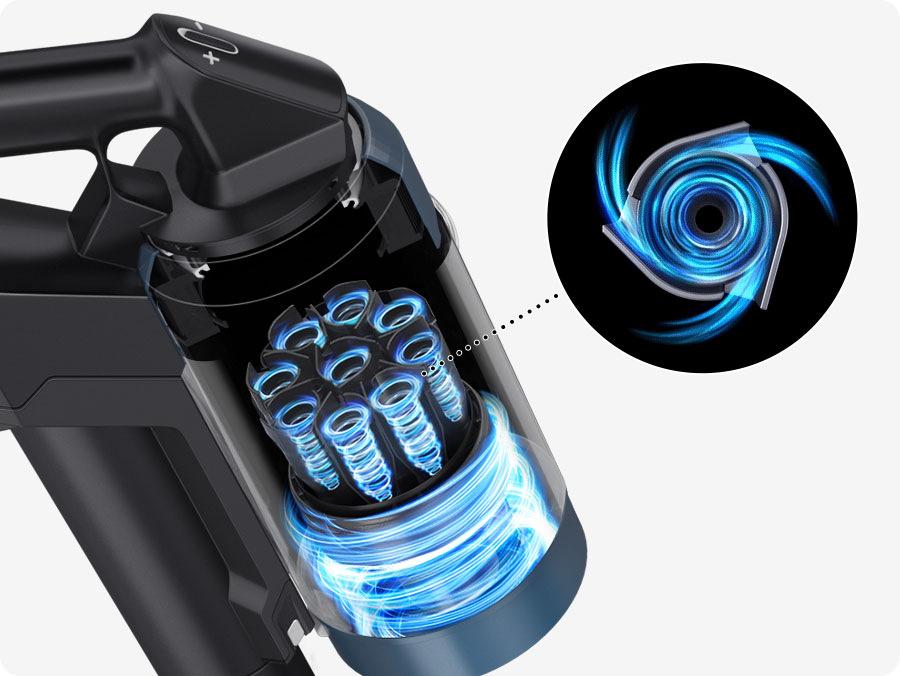 Nestrácajte čas a tešte sa z rýchlo uprataného domova vďaka vylepšenému saciemu výkonu 210 W. Efektívny systém multicyklónovej vzduchovej filtrácie zaisťuje perfektné priľnutie k povrchu a nekompromisné vtiahnutie aj tých najjemnejších zrniek prachu. Odľahčená konštrukcia navyše umožňuje príjemné ovládanie, ktoré uľaví vášmu zápästiu.