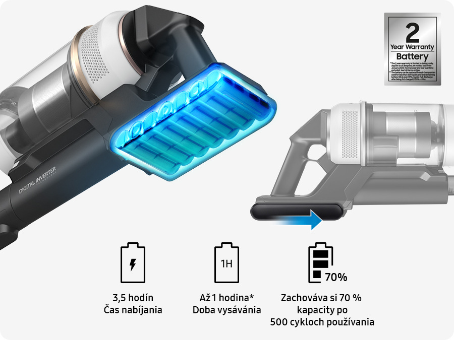 Praktické vysávanie bez nešikovných káblov si užijete až po dobu 1 hodiny vďaka extra dlhej výdrži batérie. Tá má až do 500 cyklov garantovaných 70 % z pôvodnej kapacity, zaistených navyše 2-ročnou zárukou, takže si vychutnáte dlhodobo perfektný výkon bez zdržovania neustálym nabíjaním. Pri upratovaní väčšieho priestoru si môžete výdrž vysávača jednoducho predĺžiť pomocou náhradnej batérie.